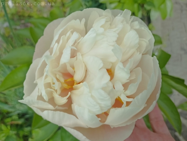 Новинка в колекції Півоній - Півонія "Блонд Віжен" (Paeonia "Blonde Vision"). Селекція: Hollingsworth, 2010, США. Життєва форма: трав'яниста. Походження: сорт - міжвидовий гібрид (P. hybrid "Sunny Boy" х P. hybrid "Nancy"). Тетраплоїд. Бічні бутони: відсутні. Діаметр квітки (Ф) та висота куща (Н): Ф=15см, Н=90см. Період цвітіння: ранній (Р).
