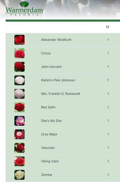 Замовили 11 новинок на Warmerdam Paeonia, NL. Очікуємо, що нашу колекцію Півоній поповнять наступні сорти: Alexander Woollcott, Crixus, John Harvard, Klehm's Pink Unknown, Mrs. Franklin D. Roosevelt, Red Satin, She's My Star, Ursa Major, Vesuvian, Viking Valor, Zemina.