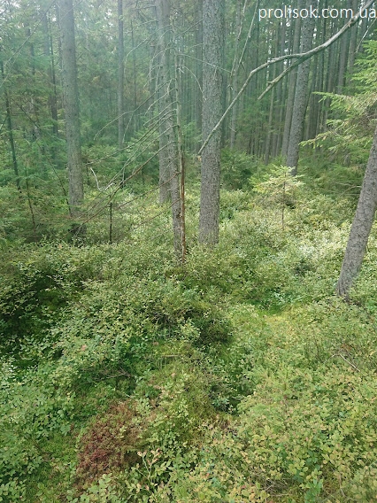 Найперше місце зупинки було з рідким ялиновим лісом. Зайшли в ліс. Ноги часом опинялись в болоті, яке було вкрито мохом та чорницею. Довкола та під ногами все зелене, вогке, навіть повітря зволожене. Отут на околіці болота, де ягідники та ялина, великими сім'ями зростав гриб - Хрящ-молочник болотяний або неїстівний (Lactarius helvus).