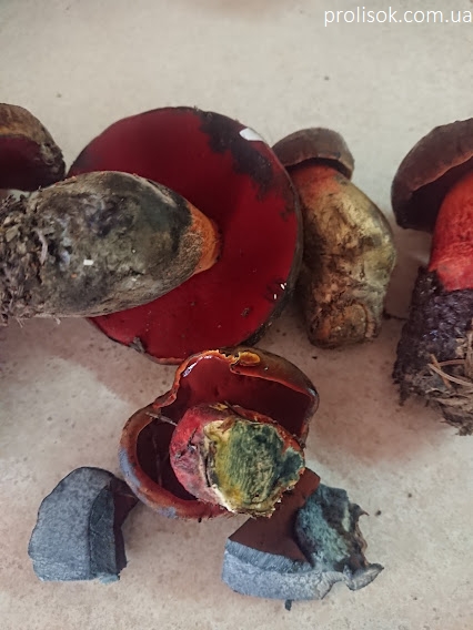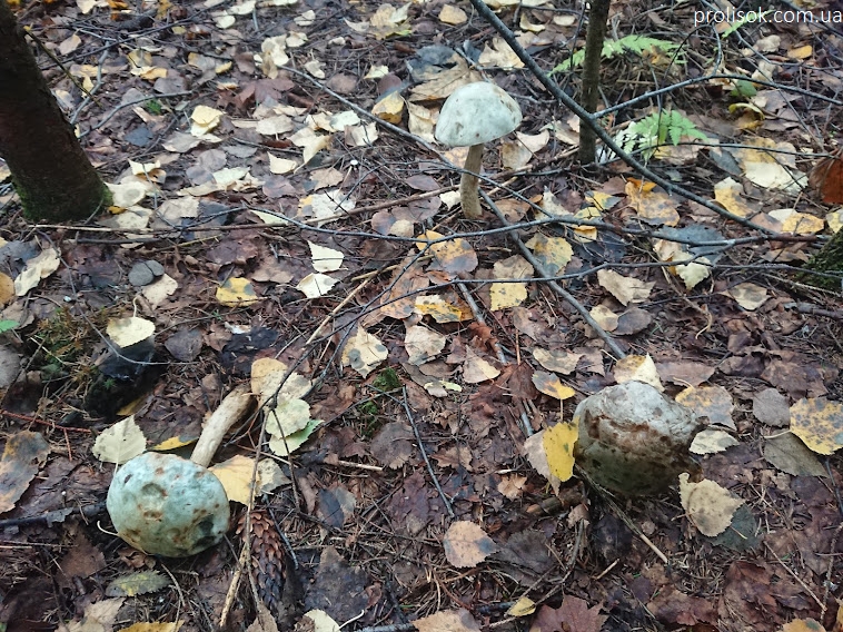 Бабка біла болотяна (Leccinum holopus). В умовах зволоження старі шапинки набувають зеленого відтінку.