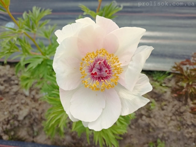 Новинка в колекції Півоній - Півонія "Цітерія" (Paeonia "Cytherea"). Селекція: Saunders, 1953, США. Життєва форма: трав'яниста. Походження: сорт - міжвидовий гібрид (Paeonia lactiflora 1875 x P. lobata). Бічні бутони: відсутні. Діаметр квітки (Ф) та висота куща (Н): Ф=15см, Н=65см. Період цвітіння: ранньо-середній (РС).