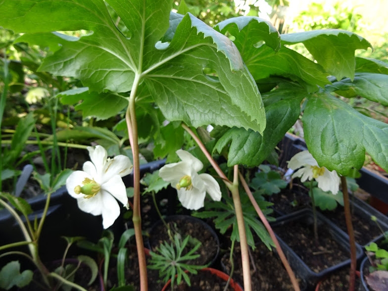 Новинка в асортименті колекційних багаторічників - Подофіл! До Вашої уваги наступний сорт: Подофіл щитоподібний (Podophyllum peltatum). Призначення рослини: із-за екзотичного вигляду може стати головною прикрасою саду, висаджують окремою плямою або створюють зарості на затіненому схилі, в стилі диких садів, в якості декоративної грунтопокривної садової рослини, для напівзатінку, як лікарська рослина. Подофіл може рости на одному місці 10-12 років.