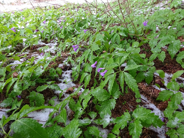 В лесу в настоящее время уже отцветают анемоны дубравные (Anemone nemorosa), первоцвет весенний (Primula veris L.). Зато в цвету зубянка железистая (Dentaria glandulosa) !!! Растет она в широколиственных и смешанных лесах, на тенистых умеренно увлажненных участках. Весенний эфемероид образует сплошной покров высотой до 20 см, что занимает иногда значительные площади.