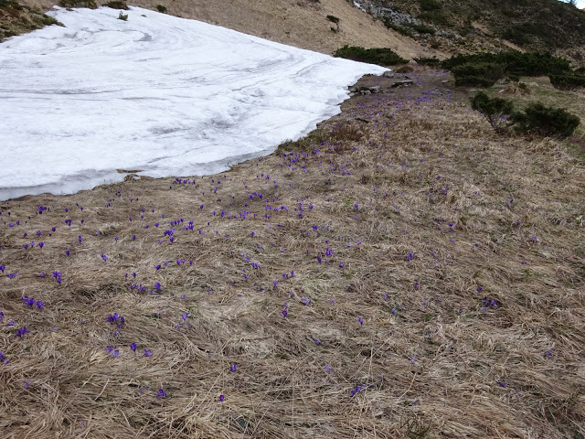 На границе леса и высокогорного луга видим папоротник блехнум колосистый (Blechnum spicant With)! Она встречается очень редко на кислых почвах Карпат в тенистых лесах в верхнем лесном поясе. На этой границе увидели медуницу Филярского (Pulmonária filarszkyana Jav.). На переувлажненных лугах вдоль ручьев желтели купальницы болотные (Caltha palustris). Изредка попадалась сальданелла венгерская (Soldanella hungarica), это только начало цветения этого удивительного растения. Под конец мая и в июне наблюдается ее массовое цветение, напоминающее местами голубой ковер.