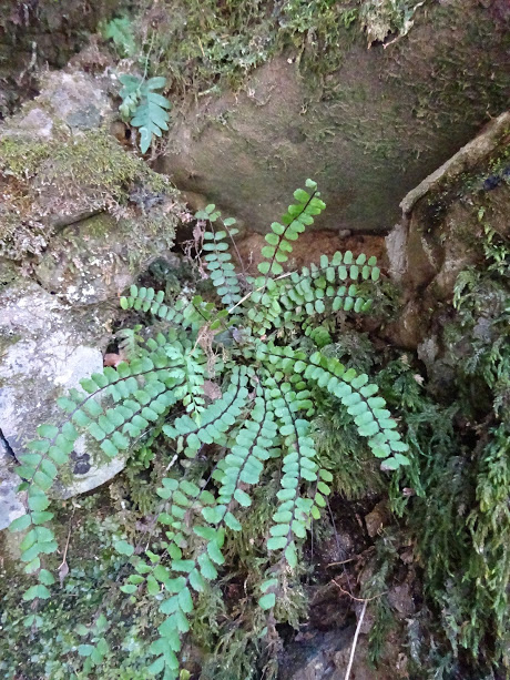 В увлажненной тени между щелями камней, где всегда прохладно, растет: Костенец волосовидный (Asplenium trichomanes).
