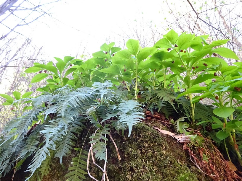 Дербянка колосистая (Blechnum spicant) - в большом количестве растет на огромных каменных глыбах, а рядом гордо голову держит Скополия карниолийская (Scopolia carniolica) со своими цветами !!!