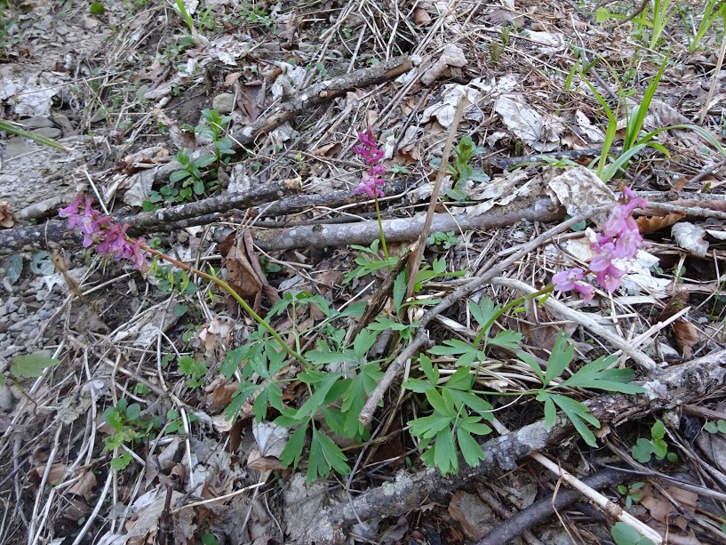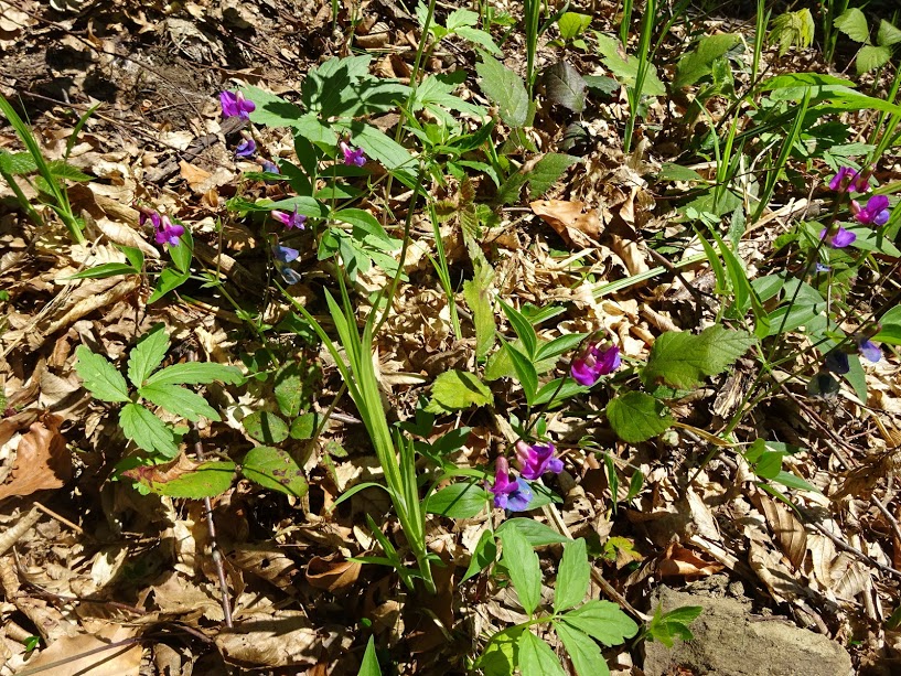 Немного дальше проехав из окна авто видим яркое растение, останавливаемся ... Это Чина весенняя (Lathyrus vernus). Первый раз увидела, как чина весенняя выглядит в своей среде. Отмечают, что очень типичная для широколиственных и смешанных лесов, растет на склонах гор. Здесь это растение одиночно и разреженно. У меня тоже чина весенняя растет в саду, может место и солнышко оказало влияние и она у нас пышная, хотя еще молодой кустик ...