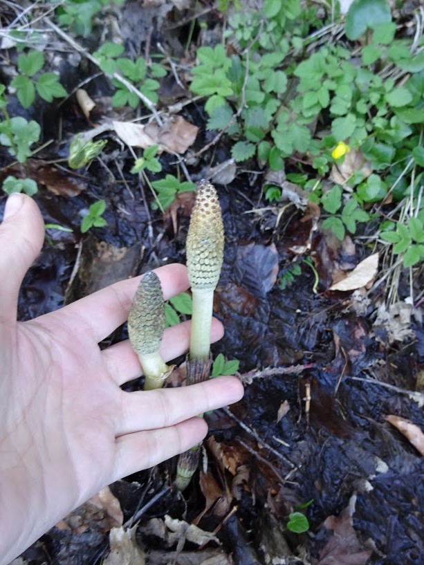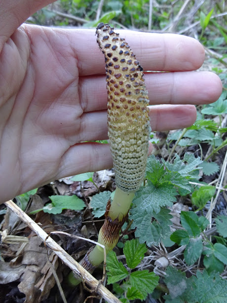 Очень интересный, да и изредка можно увидеть - Хвощ большой (Equisetum telmateia). Растение достигает 1 м высоты летом. Встречается редко в заболоченных местах, в тенистых лесах, на опушках. Удивительное растение !!!