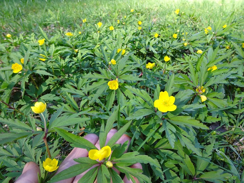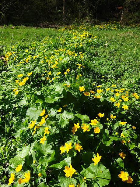 Калужница болотная (Cаltha palústris). Она разрослись через всю поляну вдоль ручейка. Только догадываешься, что там ручеек спрятан средь калужницы болотной.