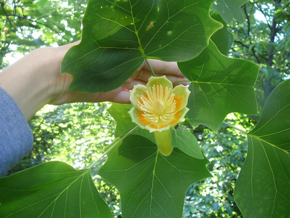 Цветки крупные, до 6 см в диаметре, зеленовато-желто-оранжевого цвета. Как и у магнолии, они поодиночно расположены на кончиках побегов. Цветы тюльпанового дерева дают большое количество нектара. В Северной Америке это растение считается самым медоносным деревом.