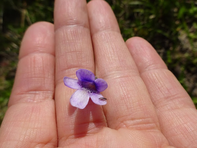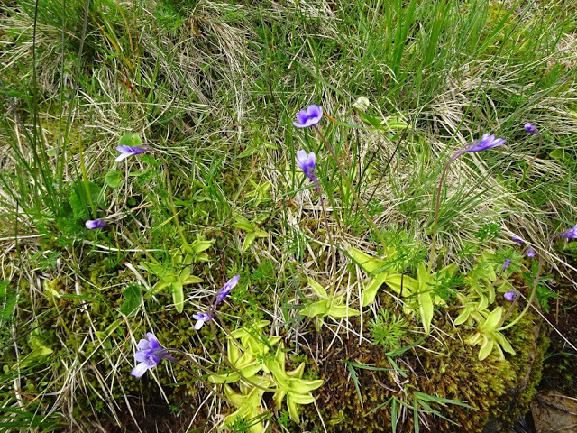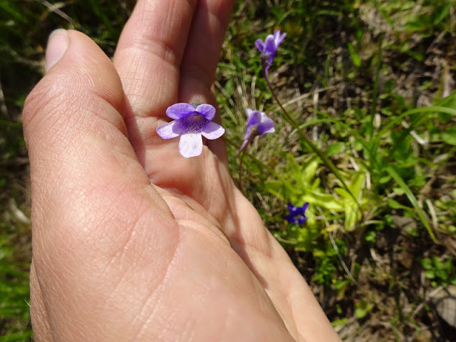 А вдоль ручья приятная неожиданность! Это растение мы ожидали увидить только у Апшанського озера, а оказалось, что оно есть и на Драгобрате! Это толстянка обыкновенная (Pinguicula vulgaris) принадлежащяя к "хищным растениям". Толстянка обыкновенная является относительно редким растением. Это растение находят преимущественно на верховых болотах. Но толстянка не достаточно разборчива по местообитанию, она встречается даже на скалах на высоте примерно 2000 м. Для нее главное, чтобы было достаточно влажно. С прижатой к земле розеткой листьев выходит цветонос с сине-фиолетовым цветком со шпорцем. На раскрытых листьях, которые имеют загнутый внутрь край, находятся в большом количестве клейкие железы, чтобы удерживать мелких насекомых. Также на листьях расположены железы, выделяющие пищеварительный сок, с помощью которого насекомые перевариваются. Таким образом растение обеспечивает себя азотом, который отсутствует в почве, но в котором оно остро нуждается. Цветет толстянка в очень разное время - с июня по сентябрь, в зависимости от места произрастания.