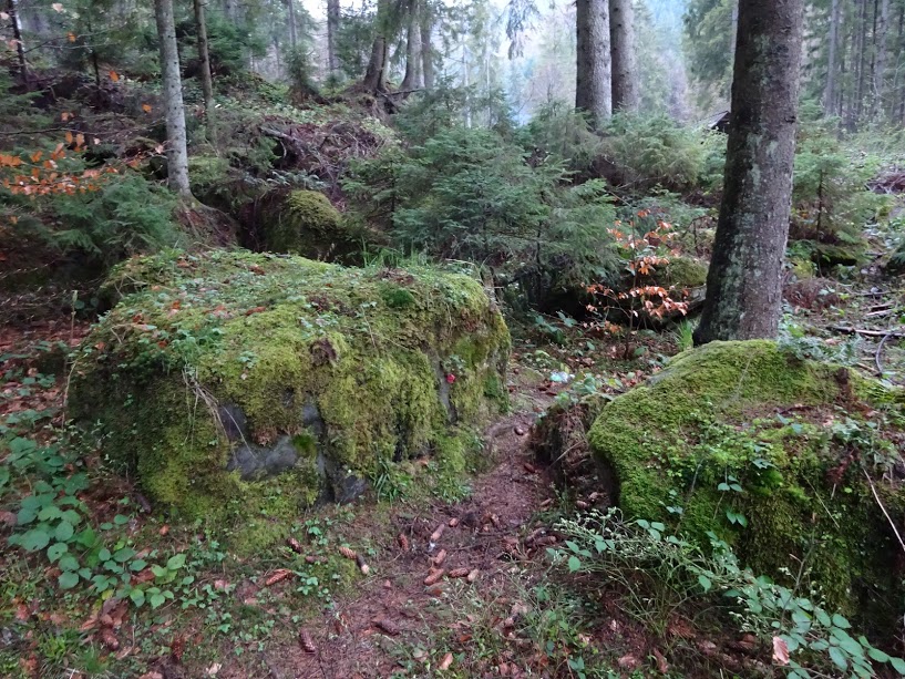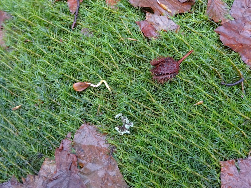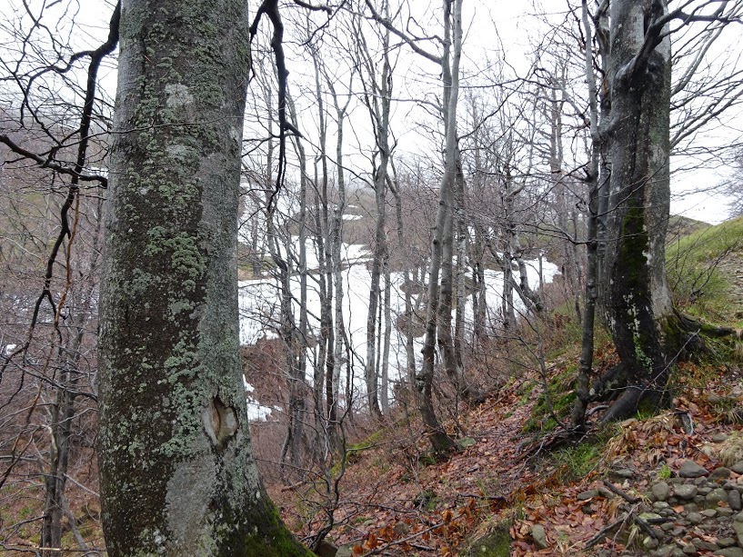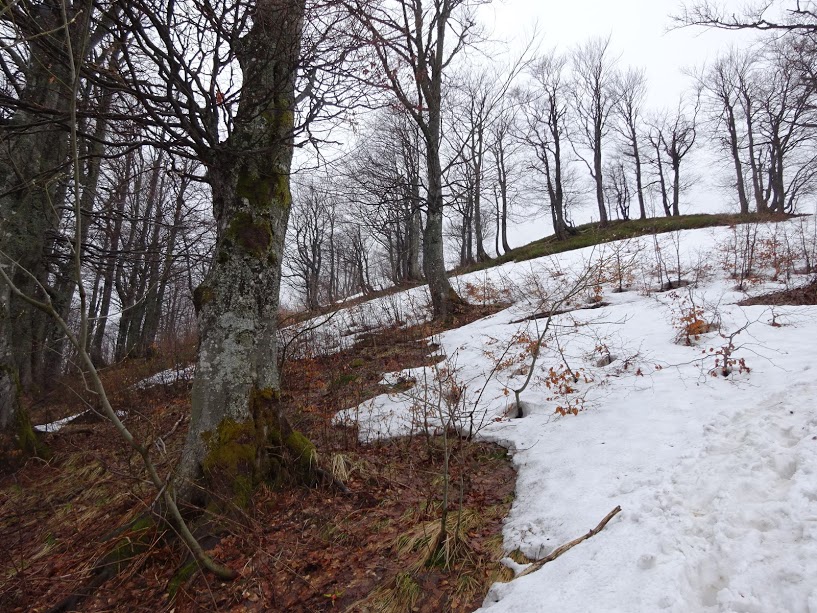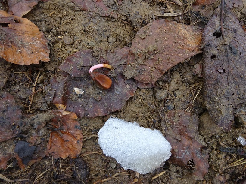 Под ногами видим орешки бука, что прорастают, они пролежали всю зиму в снегу. Проростки бука цепляются своими корнями за субстрат (листья, почву, мох), чтобы вырасти мощным деревом на этой суровой границе леса и полонины.