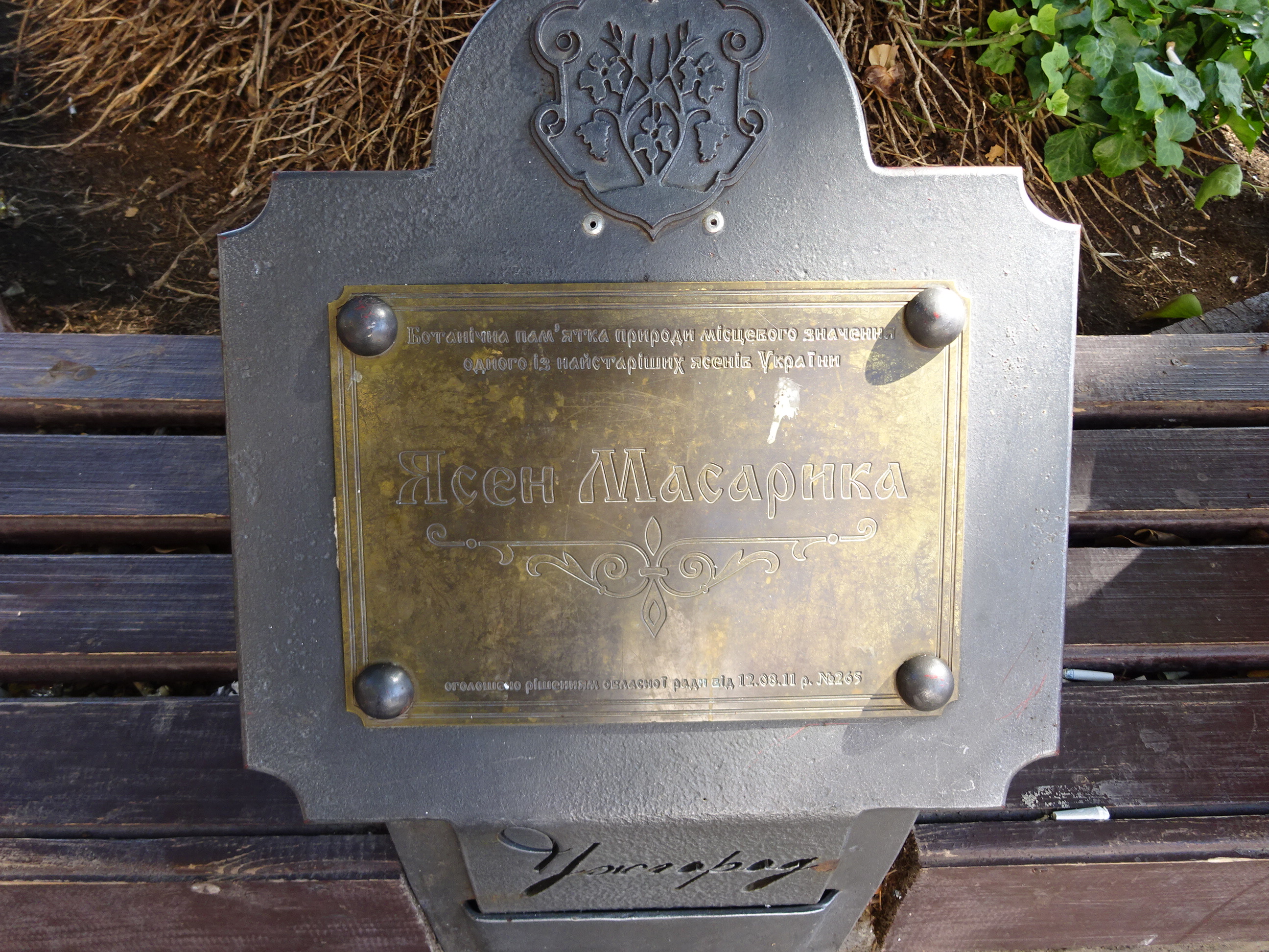 Ужгород своим зеленым убранством обязан руководителям города чехословацкого периода. Именно в то время центральная часть была очень грамотно и красиво засажена деревьями, кустами и цветами. "Ясень Масарика", назван в честь демократического к закарпатцам первого президента Чехословацкой Республики, ученого и политика Томаша-Гарика Масарика, при котором было осуществлено упорядочение и современная застройка г. Ужгорода. Во время своего президентства он внес существенный вклад в развитие социальной базы региона, повышению культуры и образования, укреплению демократических основ управления, сыграл большую роль в становлении государственных отношений, формировании либерально-демократических условий общественного развития, толерантного отношения к представителям различных национальностей и вероисповеданий.