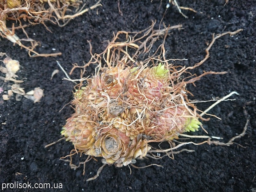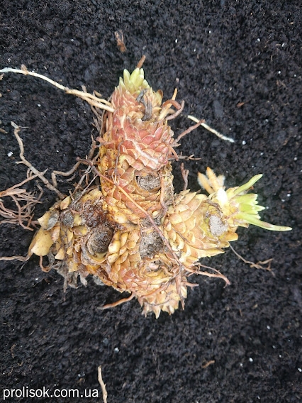 Розмір цибулини в діаметрі, см: багаторічна цибулинна рослина. Цибулина кореневищного типу, сплющена, діаметром до 8 см, біла, сильно галузиться, що утворюєть гнізда за рахунок формування кількох бруньок у пазухах численних лусок. Луски цибулин 1,5-2,5 см висоти, соковиті, білі, округлі.