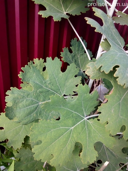 Декоративно-листяна трав'яниста багаторічна рослина до 200 см заввишки, утворює потужні, компактні кущі (опори не потребує). Має горизонтальне кореневище з численними додатковими коренями темно-оранжевого кольору. Стебло галузисте, сизувато-зелене з сизим нальотом, містить яскраво-оранжевий отруйний молочний сік. Листки великі, на довгих черешках, мають оливково-зелений колір зверху та сіро-білий знизу, розташовані в черговому порядку, зберігають декоративність до осені; нижні - до 25 см в діаметрі, верхні - дрібніші. Кожен листок має серцеподібну форму біля основи, звідси і специфічний епітет. Всі зелені частини рослини вкриті сизим нальотом. Квітки дрібні, кремові, з великою кількістю тичинок (віночок відсутній, чашолистки швидко опадають), зібрані в ажурне пірамідальне, волотисте суцвіття до 40 см завдовжки. Цвіте в липні-серпні 30-35 днів. Листя забарвлюється в кінці вересня в жовті тони. Темп зростання високий, потребує обмеження. Необхідно регулярно видаляти надлишок кореневої порослі, очищати від старих пагонів.