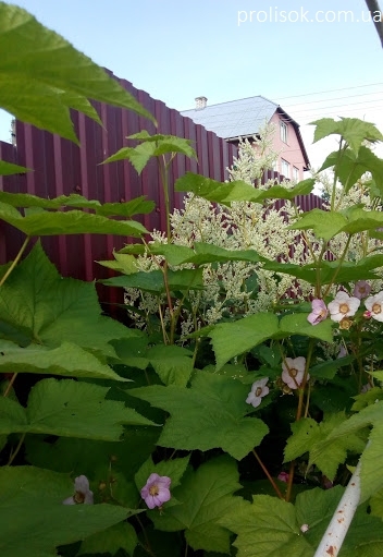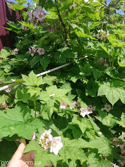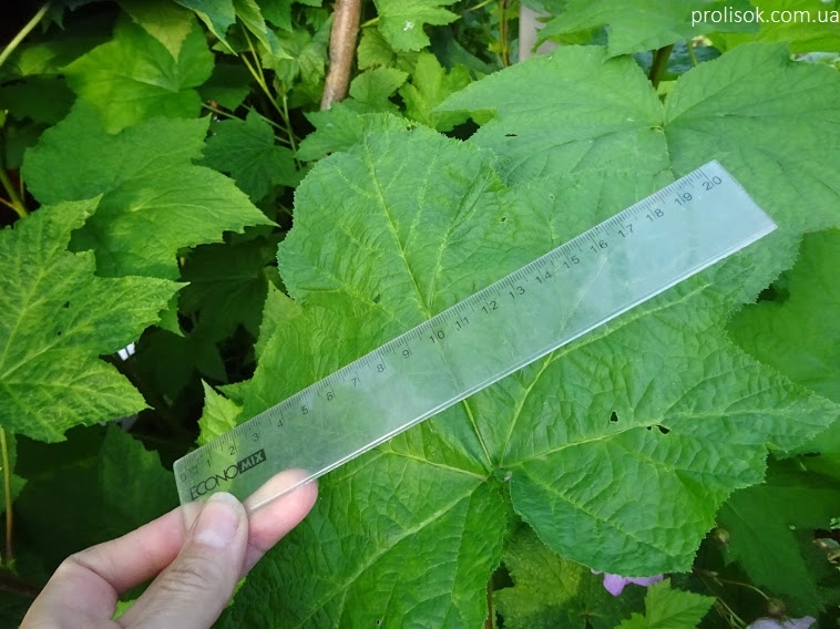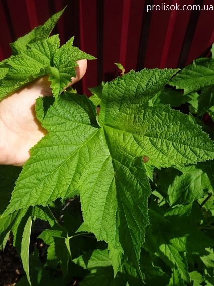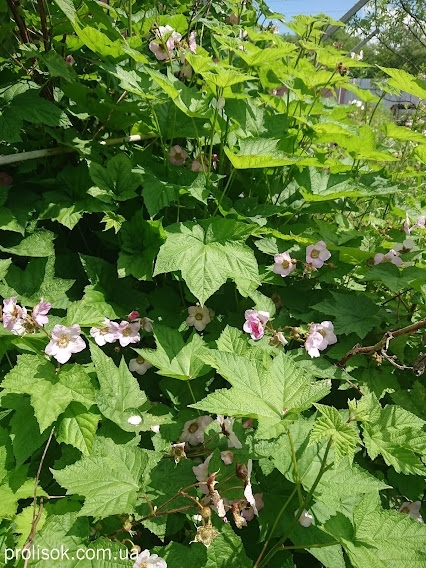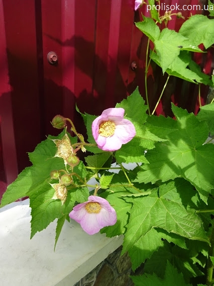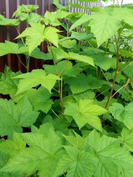 Багаторічний неколючий напівчагарник, що сягає 1,5 м у висоту, з блискучими коричневими пагонами і корою, що відшаровується. Листя прості, великі, до 20 см, 3-5-лопатеві, з гострими, яйцевидно-трикутними лопастями, схожі на кленові. Листова пластинка світло-зелена, з обох сторін опушена, залозиста, на довгому черешку. Квіти до 5 см в діаметрі, рожево-пурпурові, форма пелюсток округла, з приємним ароматом, одиночні або зібрані в коротке волотисте суцвіття. Сама квітконіжка, гілочки суцвіття і чашечка опушені. Зацвітають в першій половині червня, прикрашаючи рослину протягом всього літа. Плоди до 1 см, напівсферичні, сплюснуті, світло-червоні, кислі, їстівні, але їх зовсім небагато. Листя забарвлюється в кінці вересня в жовті тони. Темп зростання високий, потребує обмеження. Необхідно регулярно формуюча обрізка - видаляти надлишок кореневої порослі, очищати від старих пагонів, вкорочувати минулорічні пагони.